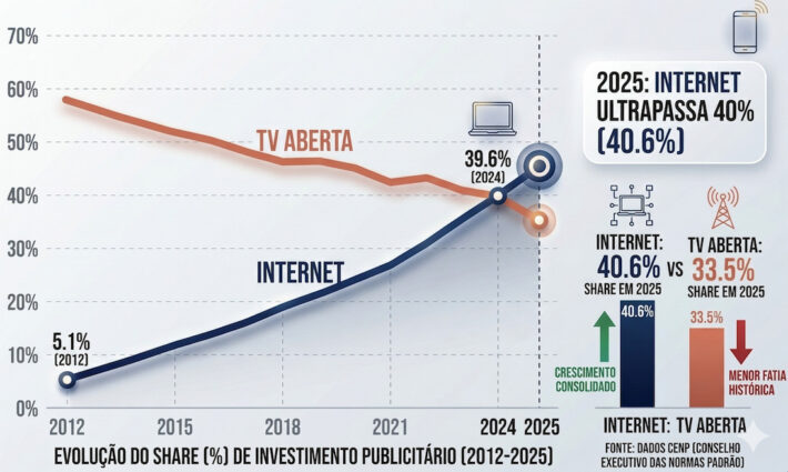 O mercado publicitário brasileiro via agências movimentou R$ 28,9 bilhões em 2025, crescimento de 10% sobre 2024 — quatro vezes acima do PIB nacional (2,3%). Pela primeira vez na história do Painel Cenp-Meios, a internet ultrapassou 40% do bolo publicitário, enquanto a Africa DDB Brasil assumiu a liderança do ranking de agências.